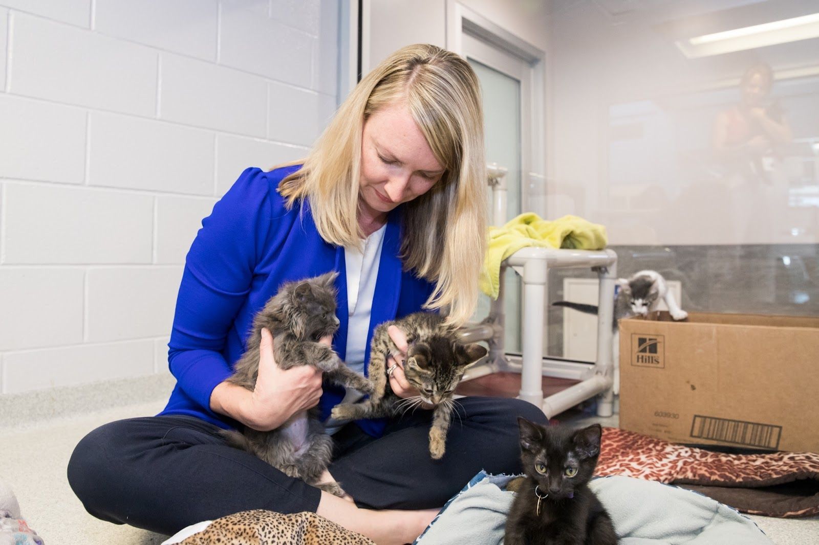 CAPTION: Dr. Karen Shenoy, Chief Veterinary Officer for Hill’s US, plays with adoptable kittens at Dumb Friends League, an animal shelter participating in NBCUniversal Local’s Clear The Shelters campaign.